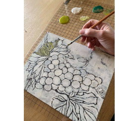 The Grapes Stamp is great fun and so versatile. You can create so many things with this stamp. Look in your recycle and you will find inspiration to upcycle jars and tins. You can of course create different designs with this stamp or you can use the individual designs to add a creative detail to furniture, a sign or tea towel or indeed any piece you are working on. You can use ink or paint with this stamp. You can also Paint this stamp after you have stamped your furniture or item.